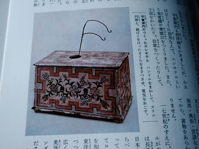 そうして源内が49歳の時、静電気発生装置=エレキテルに行き着いたそうですが、そのことはさておき、私自身が初めて「エレキテル」の写真を百科事典の中で見出した時のことはよく憶えています。おそらく5歳かそれ以前だったと思います。
