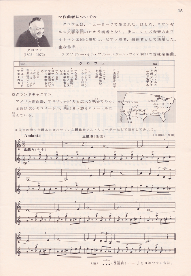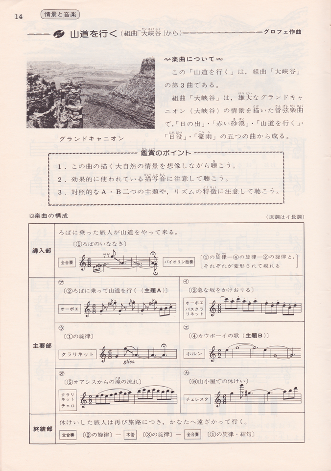 中学の教科書で“アメリカ音楽史を学ぶ”という観点でグローフェを取り上げるのであれば、ガーシュウィンを解説するとともに「ラプソディー・イン・ブルー」のレコード鑑賞を採用すべきであった。しかし、残念ながら、当時の中学1年の音楽の学習指導要領にはそうした高尚な意図はなかった。依然としてグローフェの情景表現による感性がテーマであったし、すなわち大自然の情景の音楽的転化について論じられているのである。要は、その凄まじいほどの驕奢なオーケストラゼーションの効用こそが重要なのであって、だから分かりやすい『大峡谷』なのである。