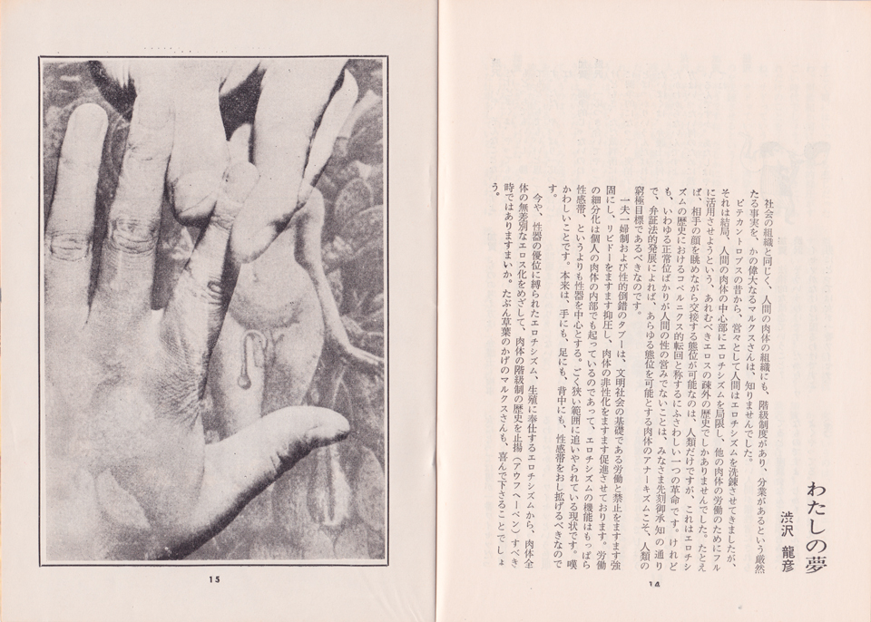 古代よりも以前から人間は、エロティシズムを洗練させてきた。然るに結局のところ、肉体労働優先のために、エロティシズムの官能は局限化されてしまったのだった。ただし、「相手の顔を見ながら交接可能」なのは人間だけであり、これは人類史におけるコペルニクス的転回である――。一夫一婦制や性的倒錯のタブーは相対的に労働と禁止(法律・規則のことか?)の体系を強固なものにし、肉体の「非性化」を促進している。だから、エロティシズムの機能は、性感帯すなわち性器中心に限定されてしまった。だとすれば、手にも足にも背中にも、性感帯をおし拡げるべきである。「生殖に奉仕するエロティシズム」から解放され、肉体全体の「無差別なエロス化」をめざせ――。