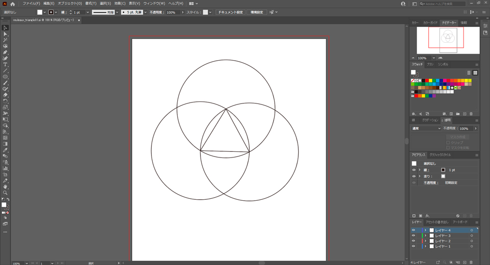 もはや実直かつ明解なこととして、図形的美しさを秘めたルーローの三角形に、ある種のフェティシズム的な魅力を感じたりはしないだろうか。『円をめぐる冒険 幾何学から文化史まで』の本に記されていたルーローの三角形の図形を真似して、実際にAdobeのイラレでルーローの三角形を描いてみたのである。